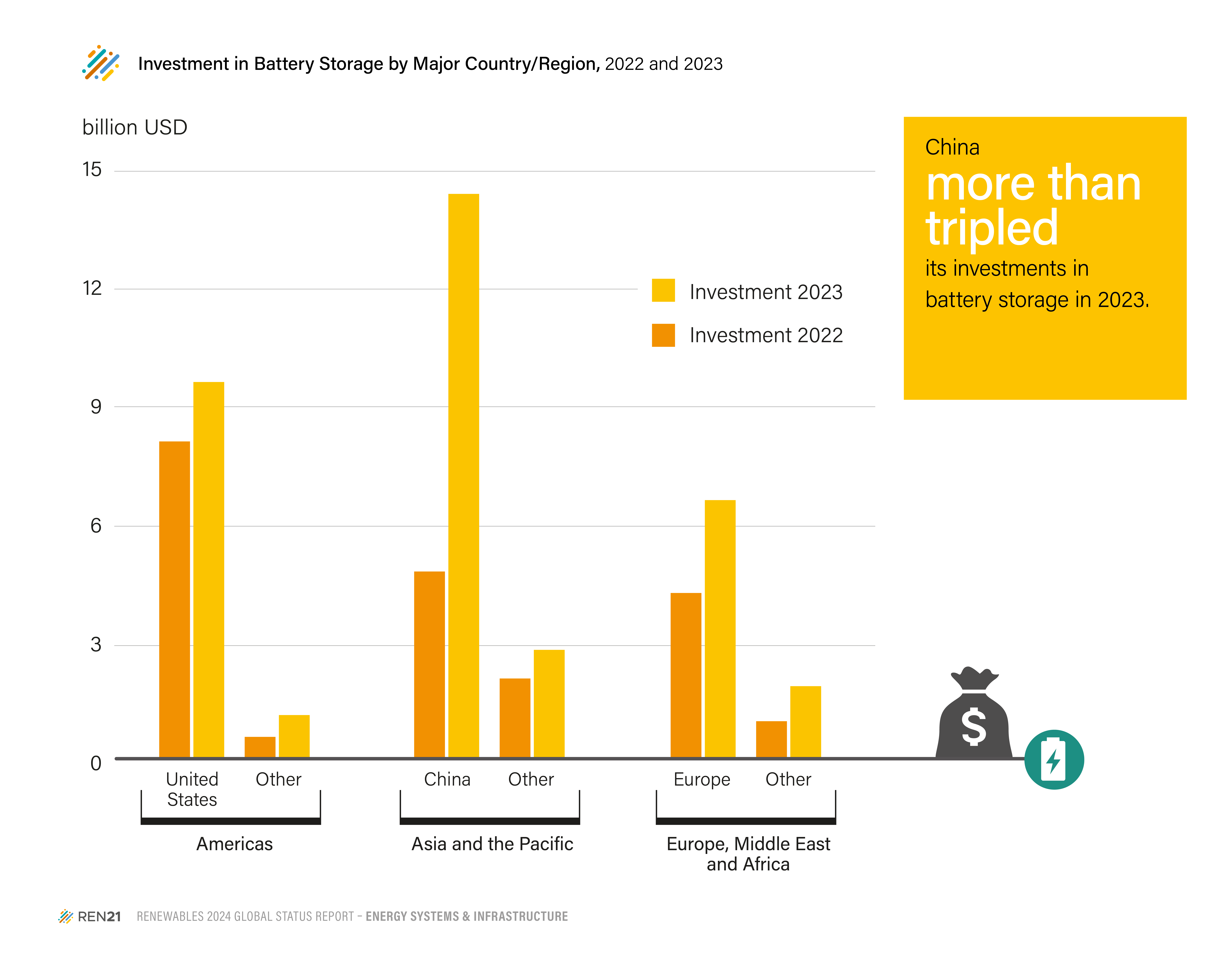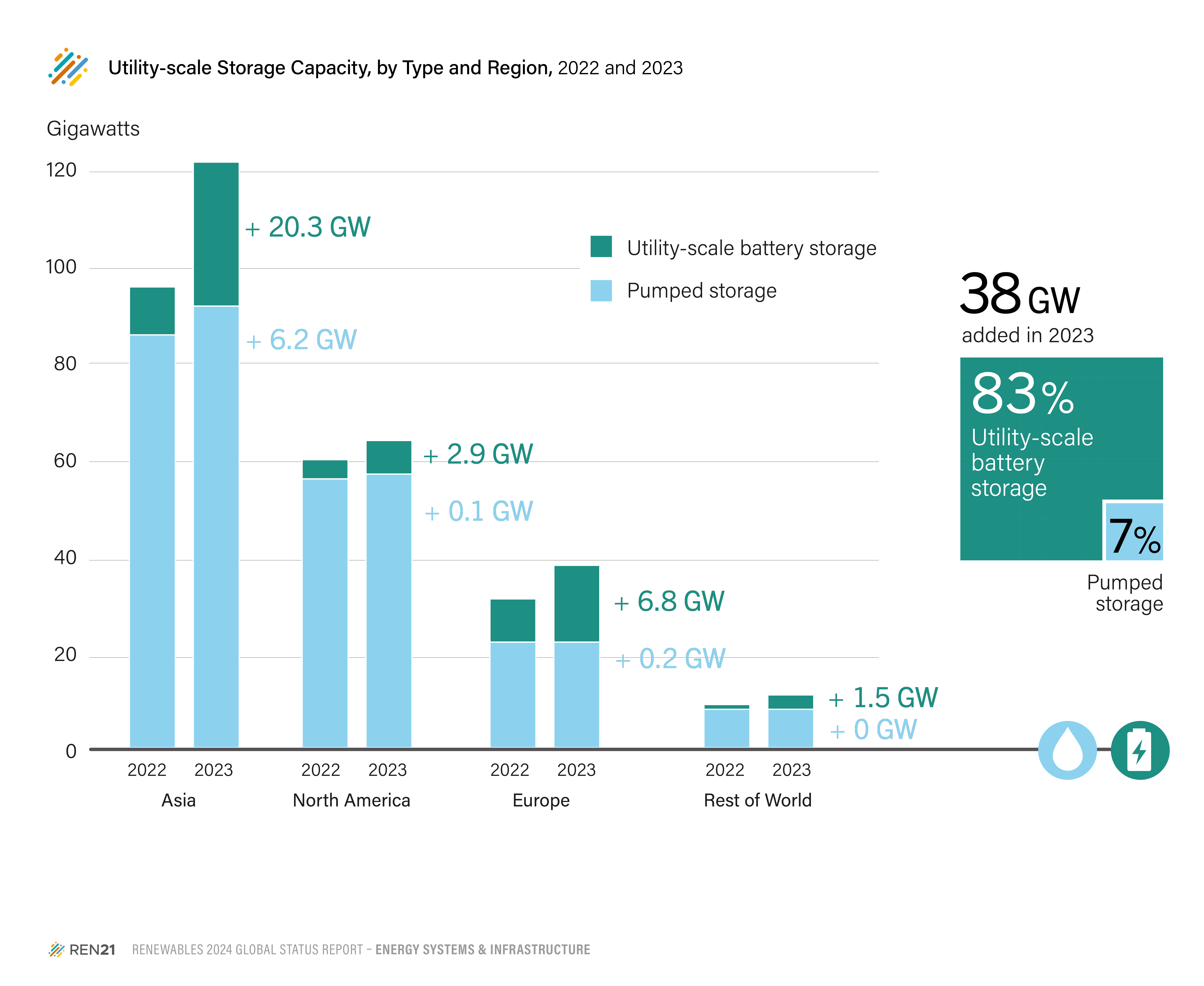ENERGY STORAGE In 2023, battery storage continued to be the fastest growing energy storage technology, with increased investment and policy attention. 76 % pumped storage share of total utility-scale energy storage 83 % batteriesʼ share of overall utility-scale storage capacity additions 120 % growth in utility-scale battery storage capacity in 2023 KEY FACTS By the end of 2023, 43 jurisdictions had in place policies for energy storage, including regulatory policies, targets, and fiscal and financial incentives. China more than tripled its investments in battery storage in 2023. Lithium-based technologies continued to dominate the battery market. Australia announced plans for the world's largest pumped storage plant in Queensland, with 5 GW capacity. Pumped storage i remains the largest energy storage technology, with a total installed capacity of 179 GW in 2023. 144 Global pumped storage capacity additions increased 6.48 GW during the year, down 38% from 2022 additions. 145 The growth in pumped storage worldwide is due in part to rising adoption of variable renewable energy, which requires more storage during off-peak producing times. 146 In many regions, pumped storage is expected to remain the most cost-effective option for large-scale utility storage for the foreseeable future. 147 Although no global datasets on pumped storage investments are available, investments in individual projects in 2023 included the Seminoe Project in the US state of Wyoming (USD 2.5 billion), the Zhejiang Jinyun Project in China (USD 1.45 billion, or CNY 10 billion) and the Gouvaes Project in Portugal (USD 1.7 billion). 148 Australia announced plans for the world's largest pumped storage plant in Queensland, which was initiated with USD 23.8 million (AUD 35 million) in public funds from the Queensland Government. 149 For battery energy storage, lithium-based technologies continued to dominate, although flow batteries also have been commissioned. 150 Average prices for lithium-ion battery packs fell to a new record low of USD 139 per kWh in 2023, following a small increase in 2022. 151 (This category is dominated by EV batteries but also includes stationary storage and electric buses; it does not cover balance-of-system costs for utility storage. 152 ) In 2023, global battery storage capacity grew 120% to reach 55.7 GW. 153 In China, battery storage capacity increased 250% to reach 27.1 GW, up from 7.8 GW in 2022. 154 In the United States, capacity grew from 9.3 GW in 2022 to 16.2 GW in 2023, and California was home to more than 5 GW of battery storage capacity, a tenfold increase from 2020. 155 The United Kingdom was the largest European market, with 3.6 GW of installed capacity, followed by Germany (1.7 GW) and Ireland (0.4 GW). 156 Other important battery storage markets were Australia, with a total installed capacity of 1.8 GW, the Republic of Korea with 1.1 GW and Japan with 0.6 GW. 157 (See Figure 3.) FIGURE 3.Utility-scale Storage Capacity, by Type and Region, 2022 and 2023 11 jurisdictions had battery storage targets as of 2023. Dedicated policy support for battery storage exists mostly in the form of targets and incentive programmes. 158 As of 2023, 11 national and sub-national jurisdictions had established targets specifically for energy battery storage. 159 (See Figure 4.) Under the EU's New Renewable Energy Directive, several Member States updated their targets for energy storage when submitting their updated National Energy and Climate Plans in 2023. 160 Greece, for example, set a target for 3.1 GW of battery storage and 2.2 GW of pumped storage capacity by 2030. 161 FIGURE 4.National and Sub-National Targets, Policies and Fiscal/Financial Incentives for Renewable Energy Storage, 2023 FIGURE 5.Investment in Battery Storage by Major Country/Region, 2022 and 2023 China more than tripled its investments in battery storage in 2023. As of 2023, 18 national and sub-national jurisdictions had regulatory policies for energy storage, and 33 jurisdictions had fiscal and financial incentives to support battery storage. 162 (See Figure 4.) Hungary announced a USD 337 million (HUF 120 billion) investment support scheme through grants to support the construction of utility-scale battery storage and its operation for at least 10 years. 163 Spain awarded USD 166 million (EUR 150 million) in subsidies for 36 battery storage projects that are combined with renewable energy power plants, as well as USD 310 million (EUR 280 million) in grants for stand-alone battery storage, thermal energy storage and pumped storage projects. 164 In March 2023, the European Commission released a set of guidelines on energy storage, with proposed policy measures aimed at facilitating wider implementation of electricity storage solutions across the region. 165 In early 2024, Italy released new regulations on the Electric Storage Capacity Procurement Mechanism, which is expected to encourage large capacity auctions for grid-scale battery and power-to-gas storage. 166 South Africa's Renewable Energy Master Plan specifies a strategy for the country's energy storage value chain. 167 At the sub-national level, the US states of California, Illinois, Maryland and New Mexico have implemented policies to refine the interconnection standards for distributed energy resources, with special attention to battery storage. 168 Investment in battery storage worldwide continued its substantial growth trend, increasing 76.8% in 2023 to reach USD 36.3 billion. 169 China dominated with USD 14.5 billion (up 203%), followed by the United States (USD 9.6 billion; up 18.8%) and Germany (USD 3.3 billion; up 61.2%). 170 (See Figure 5.) Energy storage investments also surged in Italy (reaching USD 2.2 billion) and Australia (USD 1.0 billion). 171 Growth in battery storage investment in China was due mainly to favourable economics for utility-scale battery storage and to strong policy support. 172 In 2023, construction began on the country's first combined comp