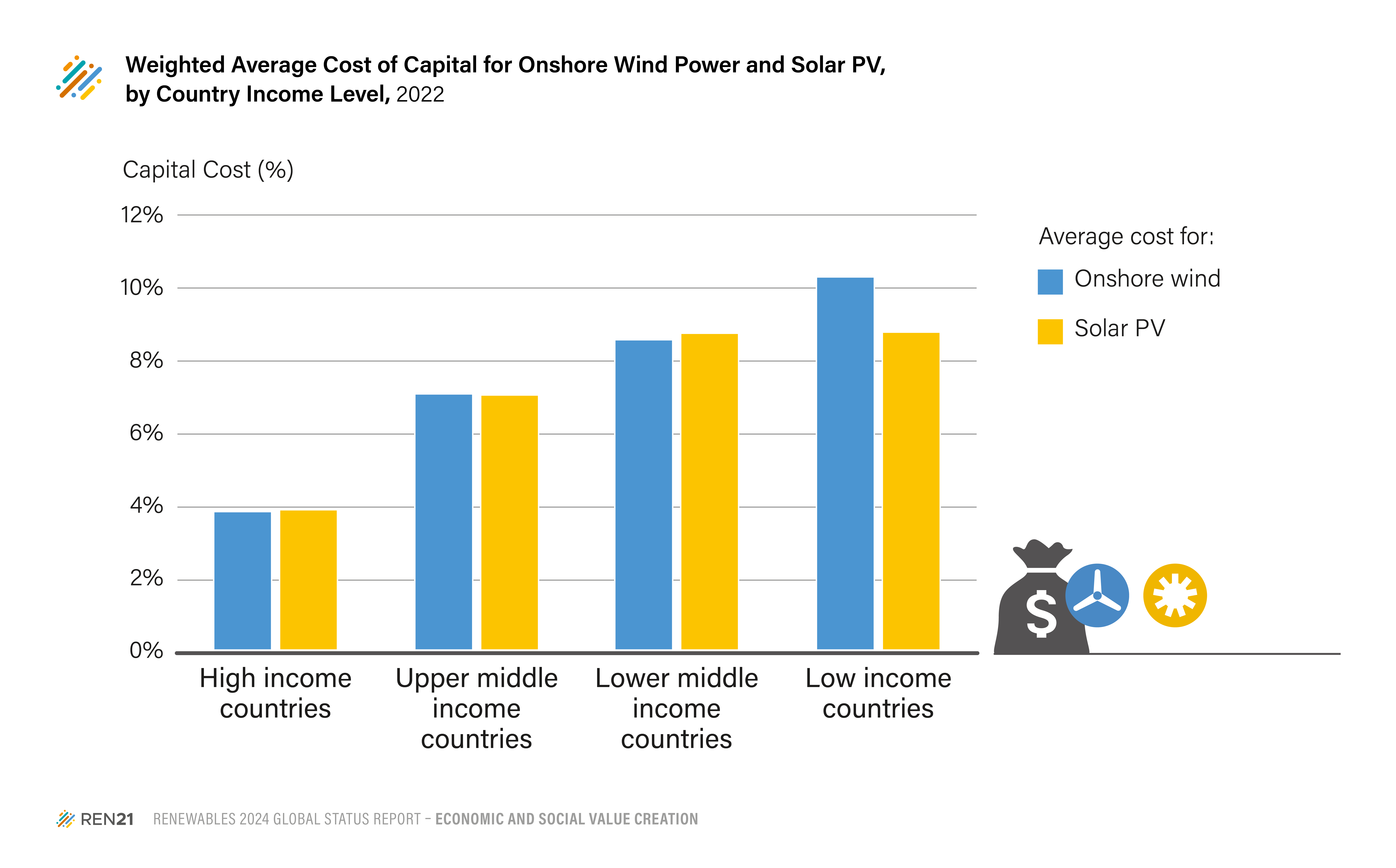 Capital Flows Sources of Renewable Energy Investment Typically, the private sector has driven investment decisions related to energy assets, with corporations providing on average 48% of total energy investment between 2018 and 2023 and households 15%; governments and state-owned enterprises contributed 37%. 123 However, this varies greatly by country: in emerging and developing economies, governments provided near 50% of investment on average, compared to only 15% in advanced economies. 124 Renewable energy has enhanced the role of citizens in energy investments. Driven by increasing investments in rooftop solar, buildings efficiency, and electric vehicle purchases, households (mainly wealthier) have become key actors in energy investment decisions, doubling from a 9% share of total investment in 2015 to 18% in 2023. 125 The growing deployment of renewable technologies has driven innovations that both improve production efficiency and lower costs. 126 Large cost reductions in renewables in the past decade have increased their competitiveness compared to fossil fuels. In 2023, the global weighted average levelised cost of electricity (LCOE) from newly commissioned renewable projects fell across most technologies, including solar PV (down 12%), hydropower (7%), offshore wind (7%), onshore wind (3%) and concentrating solar power (CSP; 4%). 127 In 2023, an estimated 81% of the total utility-scale renewable power projects added during the year had lower costs than their fossil fuel-fired alternatives. 128 This means that renewable energy is already leading to cost savings. As of 2023, the total renewable power deployed globally since 2000 had saved an estimated USD 409 billion in fuel costs in the power sector. 129 Such cost savings allow countries, particularly small island developing states (SIDS), to invest more in required climate change adaptation measures. 130 However, the LCOE alone does not determine whether an investment decision is made. The upfront cost of renewable energy deployment can be significant for countries and communities with limited resources, requiring financial and technical support. 131 The distribution of investment over time is an important factor in decisions as well. Capital expenditure for renewable energy projects is concentrated in the deployment phase; projects require a large upfront investment but then typically have low operating costs and no fuel costs (in the case of solar and wind). Given the capital intensity of renewables, access to capital is an essential building block of energy transitions everywhere. However, access to funds is uneven worldwide, which could lead to a two-speed energy transition. 132 In 2022, the weighted average cost of capital for onshore wind power and solar PV neared 10% in low-income countries and 4% in high-income economies. 133 (See Figure 3.) Fiscal Policy for Renewables: Taxation and Subsidies Fiscal policy can be mobilised for renewable energy in two main ways. Firstly, the revenue from certain fiscal instruments (especially fossil fuel taxes) can be used to enhance spending on renewables. Secondly, that extra fiscal space generated can be used in the form of tax reductions or subsidies for renewable energy. Taxation and Public Budgets In 2023, the income from carbon pricing instruments globally surpassed USD 100 billion, a record high, growing from USD 26 billion in 2015. 134 The number of such instruments, including carbon taxes and emission trading systems, increased from 38 in 2015 to 74 in 2023. 135 However, income from energy-related fiscal policies represents only a small part of total public revenues. In the Euro area, energy taxes contributed 4.8% of public revenues in 2019. 136 Carbon pricing can be a tool to raise revenues that can then be used for renewable energy finance in developing countries. 137 Carbon pricing can be a tool to raise revenue that can then be used to finance projects of renewable energy in developing countries. However, since this revenue is volatile and will fluctuate and diminish in the long term, countries may establish a dedicated fund to support renewable energy. This fund can be financed by carbon revenues as well as other sources, ensuring its long-term sustainability. 138 In 2023, around 52% of carbon revenues worldwide were used for climate and nature expenditures (including renewables). 139 Germany is dedicating a lot of its carbon revenue to energy efficiency in buildings, decarbonising industry, electromobility and renewable energy through the Climate and Transformation Fund (KTF). 140 In the United States, close to 90% of the revenue from the Regional Greenhouse Gas Initiative (RGGI) i is being applied to energy efficiency, electrification, greenhouse gas abatement, and clean and renewable energy. 141 Japan is using the entirety of revenues from its carbon tax to support low-carbon innovation, energy saving for small and medium-sized enterprises and financial assistance for local projects in energy savings and renewables. 142 In Denmark, a tax on air passengers is being used to finance the transition to greener practices in the aviation industry. 143 The government's proposed average tax of DKK 100 (USD 14.35) on air travel would help finance the industry's green transition, which aims to enable all domestic flights to use 100% sustainable fuels by 2030. 144 Tax Reductions and Tax Breaks for Renewables Tax reductions have become an increasingly popular policy choice to encourage the deployment of renewable energy and enabling technologies. Subsidies are mainly consumer facing, aimed at making these technologies accessible to households. While some countries (such as Iceland) are subsidising imports, others (such as Italy) are using subsidies to increase local manufacturing competitiveness (See Local Value Creation section). FIGURE 3.Weighted Average Cost of Capital for Onshore Wind Power and Solar PV, by Country Income Level, 2022 In 2022, there was a gap of over 4 percentage 